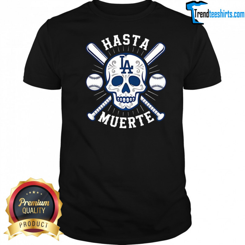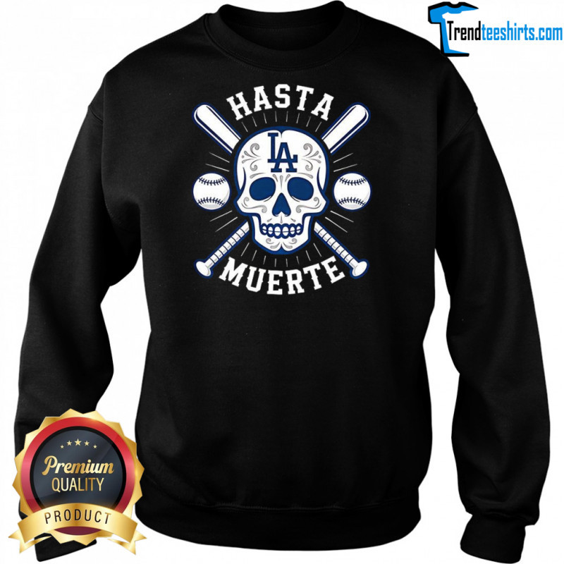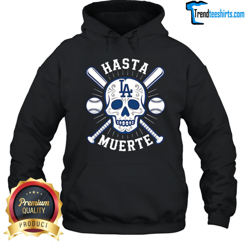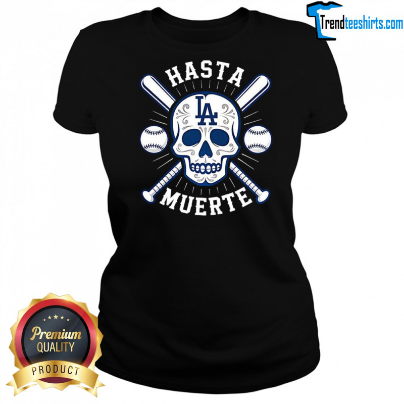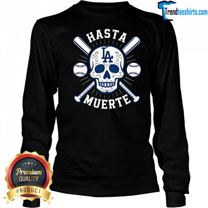 Buy here: Los Angeles Dodgers Hasta Muerte skull and cross bat shirt, hoodie, sweater, longsleeve and ladies t-shirt